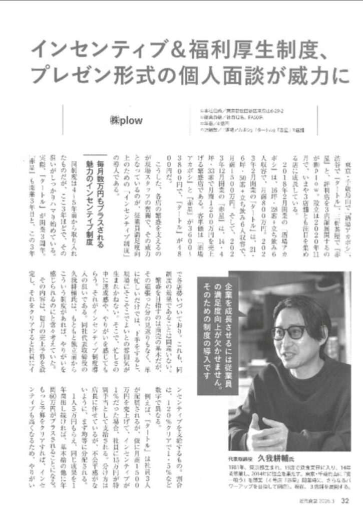 飲食業界の専門誌「近代食堂」2026年3月号にて、当社(株式会社plow)の組織づくりや、運営店舗である『タートル(渋谷)』の取り組みが詳しく紹介されました。